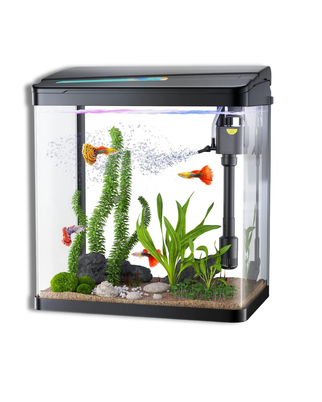 Acuario completo (de vidrio) de 18 lts con tapa, filtro seco-húmedo e iluminación led. Medidas: 30×19.5×32 cm