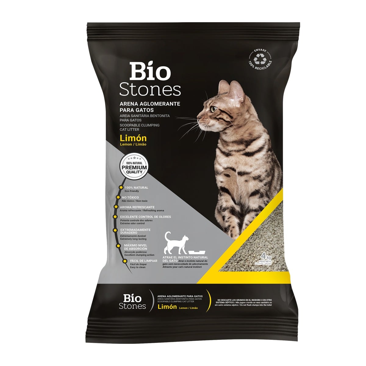 Arena aglomerante para gatos de bentonita sódica 100% natural. No tóxica, con aroma a limón, gran control de olores, duradera y fácil de limpiar. Viene en fundas de 6 paquetes, 4 kg cada uno.