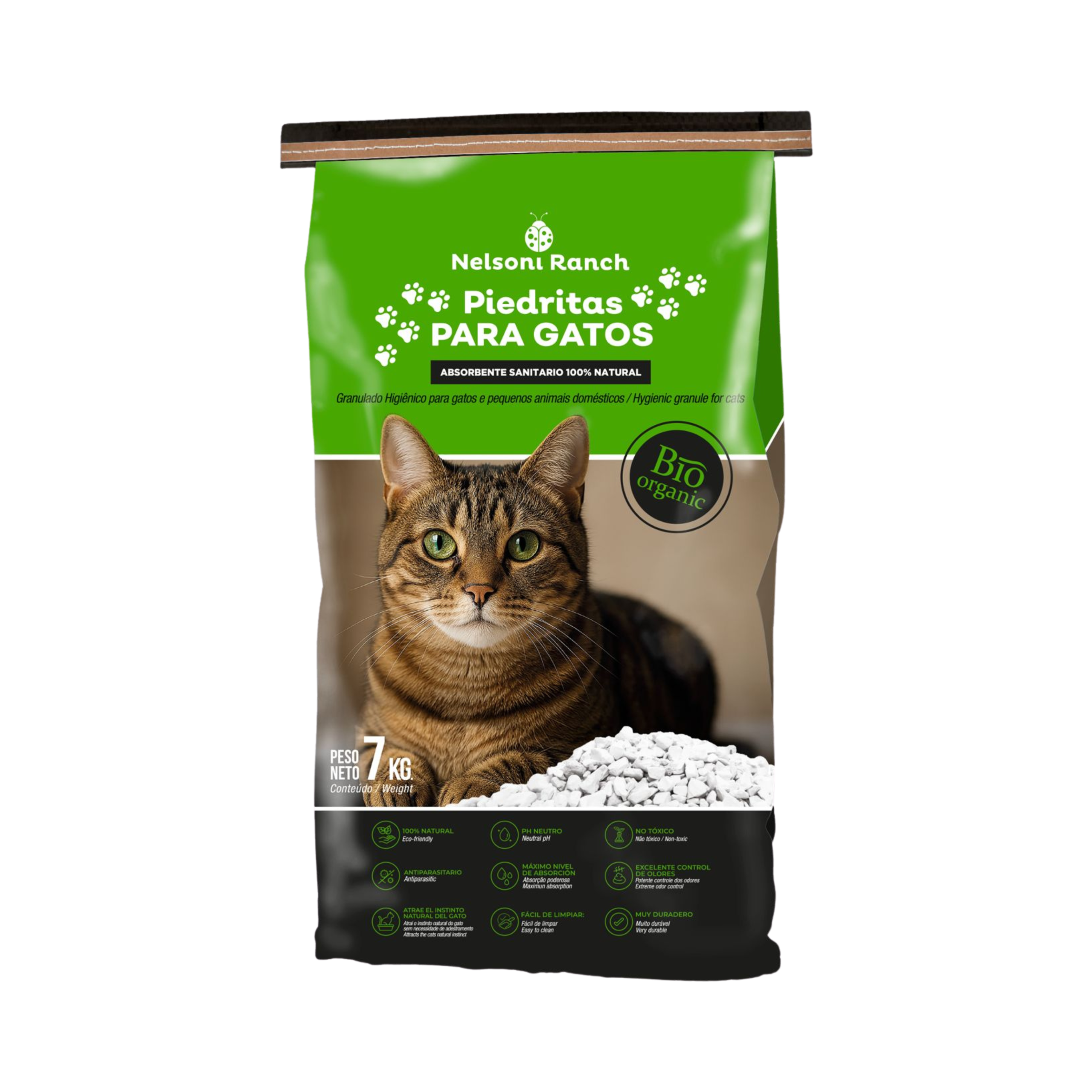 Piedra blanca para gatos Nelsoni Ranch, conocida por su capacidad de absorción. Ideal para mantener el área de tu gato limpia y libre de malos olores.