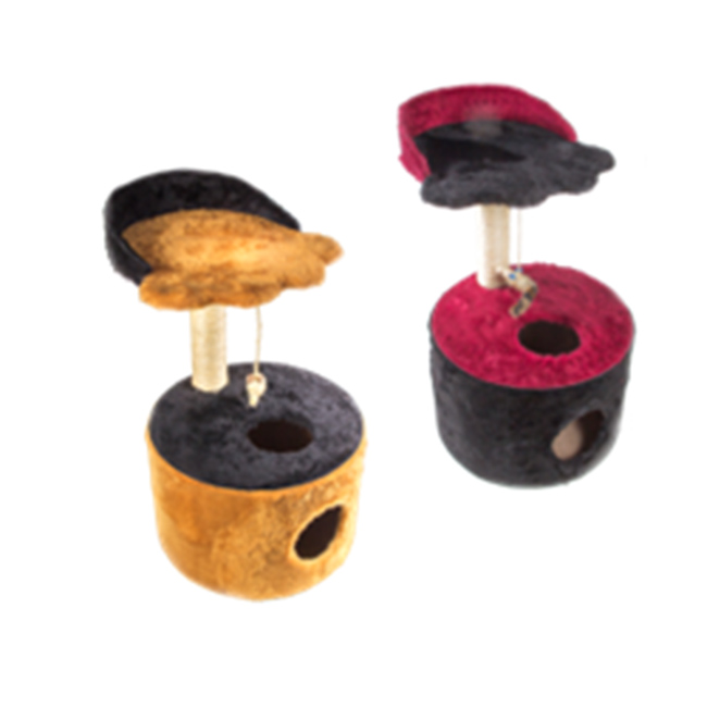 Rascador 2 niveles con escondite, torre, piso superior con forma de pata y cuerda con ratón. Medidas: 45*48*75 cm